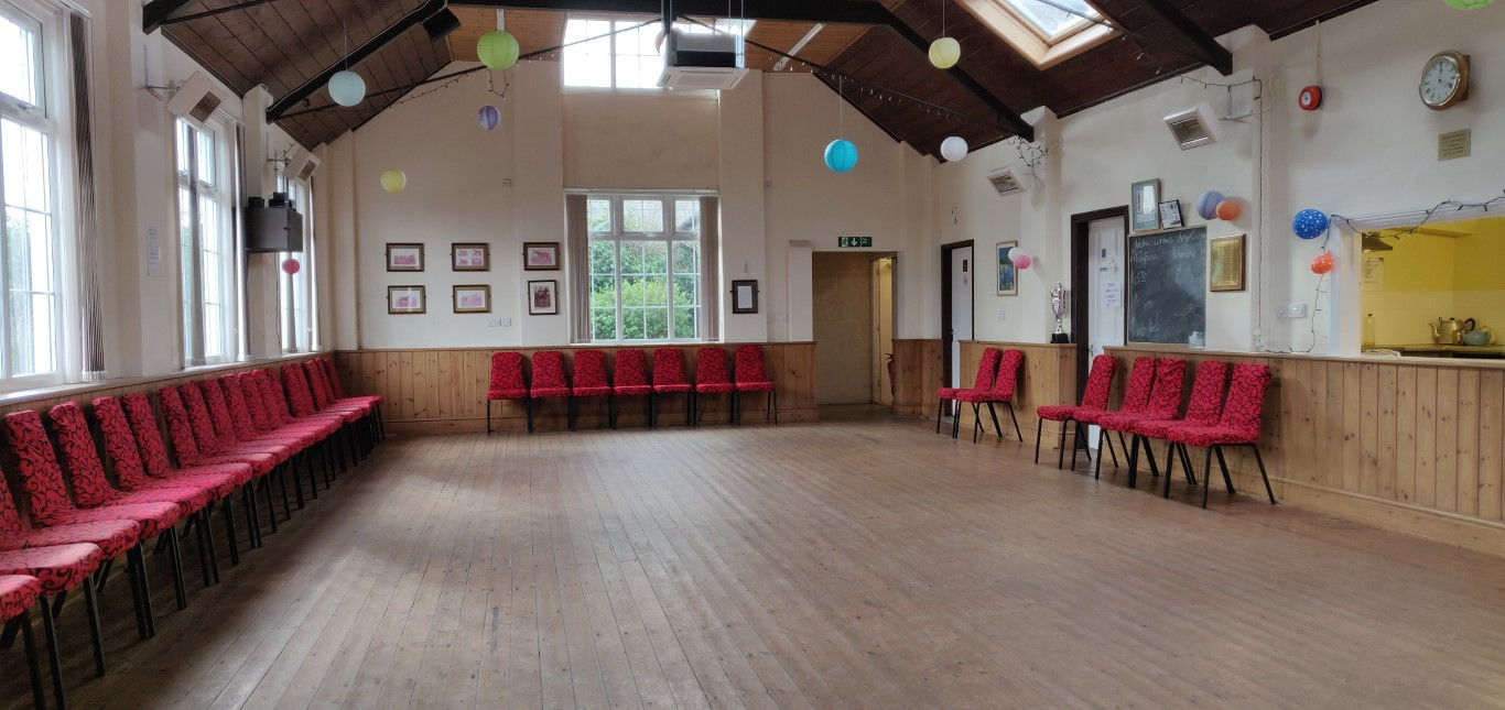 The main hall is spacious and is suitable for a variety of activities. There is a natural wood floor, great for dancing and exercise classes. Lighting is dimmable, energy efficient and the new heating is eco-friendly. From 2023 there is a brand new audio-visual system, with laser-projector and large automatic screen and multi-input, hearing-loop friendly audio.